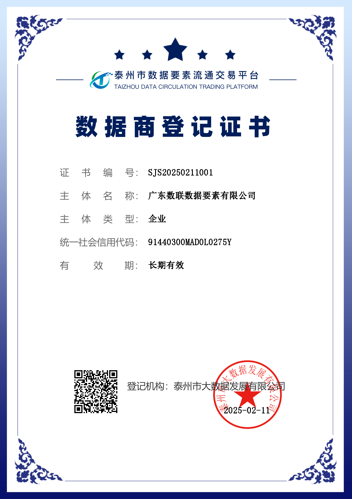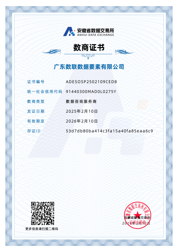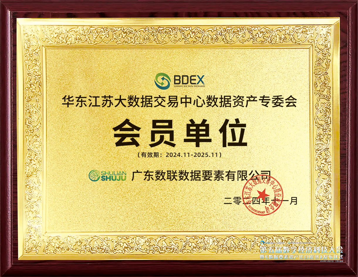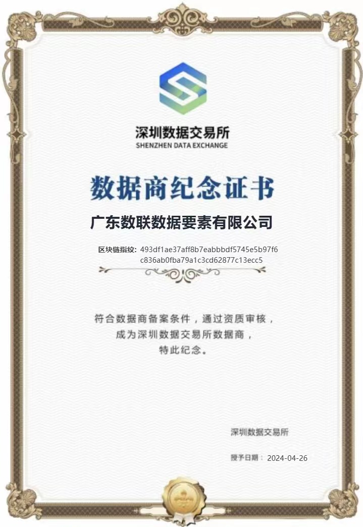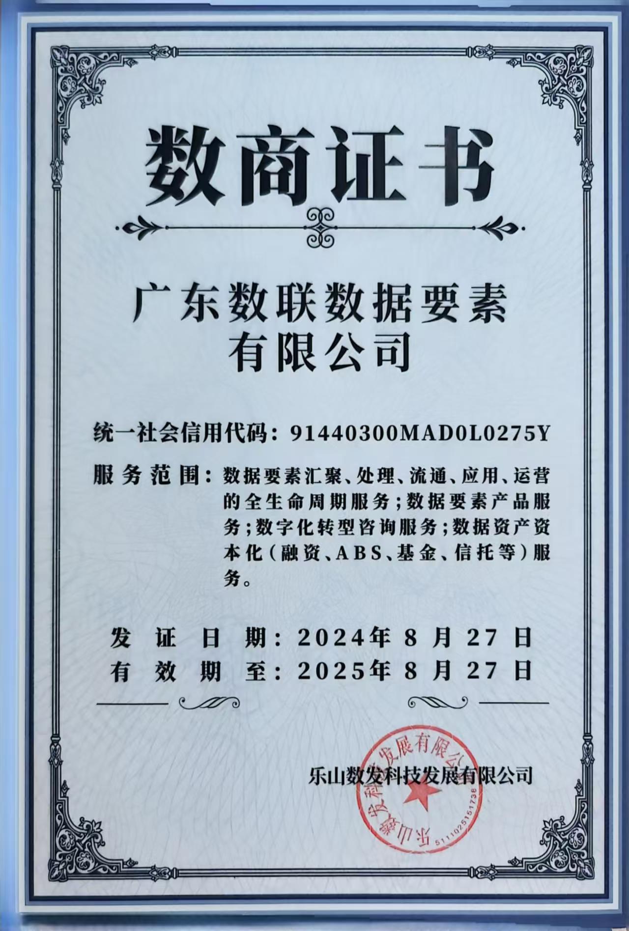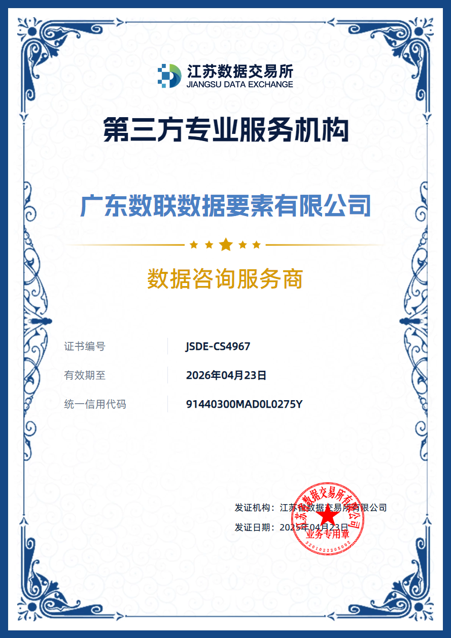 广东数联数据要素有限公司,国内首家数据资产价值变现全链路一站式数据服务商。广东数联数据要素有限公司为立足深圳、辐射全国的一家专注数据要素一站式服务数商,业务涵盖企业数据法律合规、数据质量评价、数据资产入表辅导、数据资产价格评估、数据交易经纪、数据产品挂牌、数据资产管理以及企业高管数据素养提升与数据治理能力培训工作,同时提供数据资产金融市场业务咨询辅导。广东数联数据要素有限公司当前已在国内38家数据交易所获得数商资质认证!各项资质超50余项!公司为2024年第七届数字中国峰会深圳区域数商代表、2024年贵阳第十届数博会数据资产服务联合单位、国家2024数据要素蓝皮书牵头单位及核心策划单位、2024年深圳数据交易所优秀数商、广州数据交易所天河专区联合运营方;公司实际控制人林楠受聘为浙江大数据交易中心数据要素X认证行业专家、江苏省大数据交易和流通工程实验室数据资产专委会专家委员、DAC全球数据资产理事会粤港澳中心主任、全球数据资产运营中心广州基地负责人等,当前已在深圳、北京、河北、河南、湖南、广东、江西、四川等多地落地成功案例,是当前国内顶流数据服务机构之一。