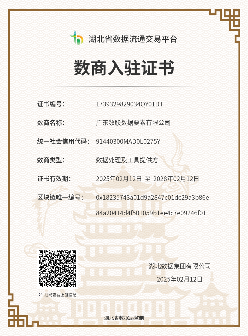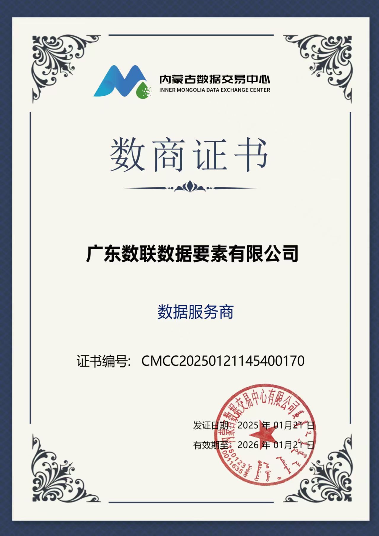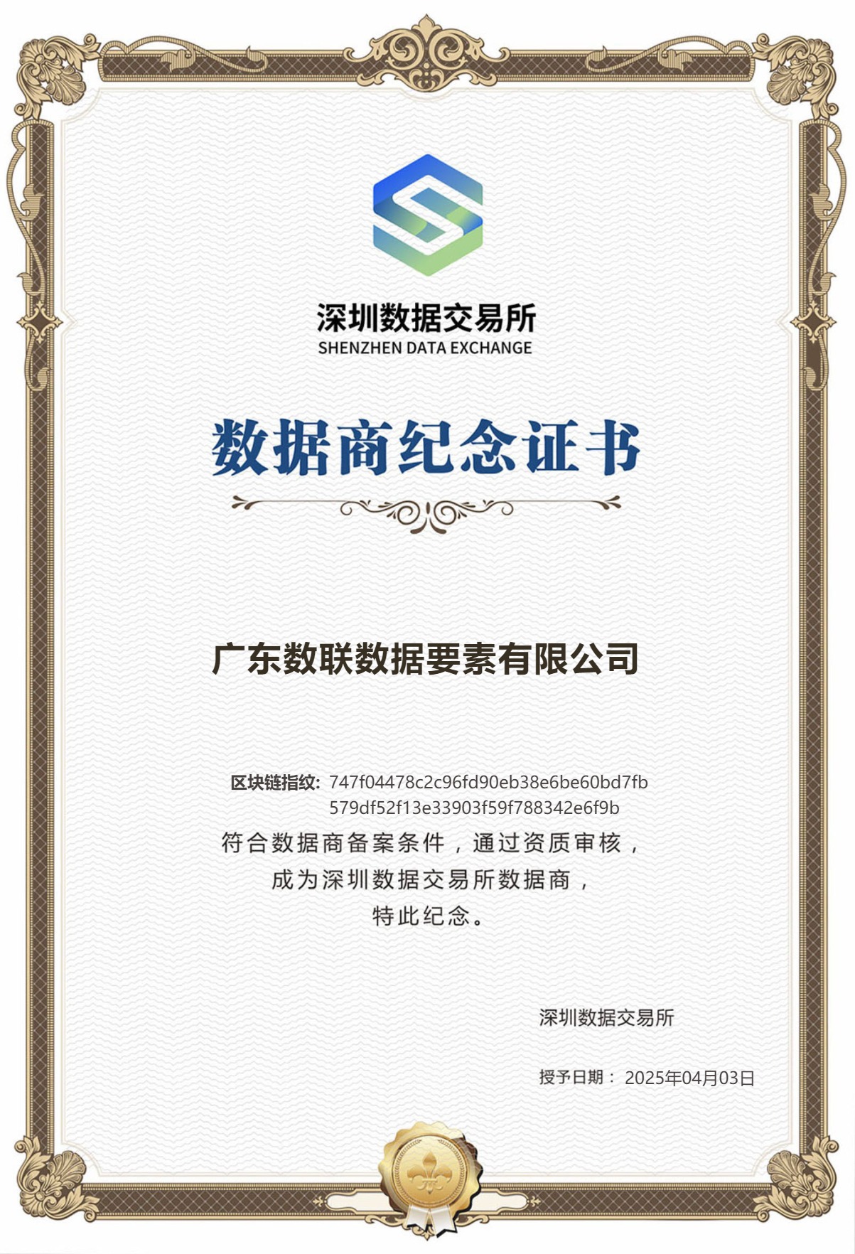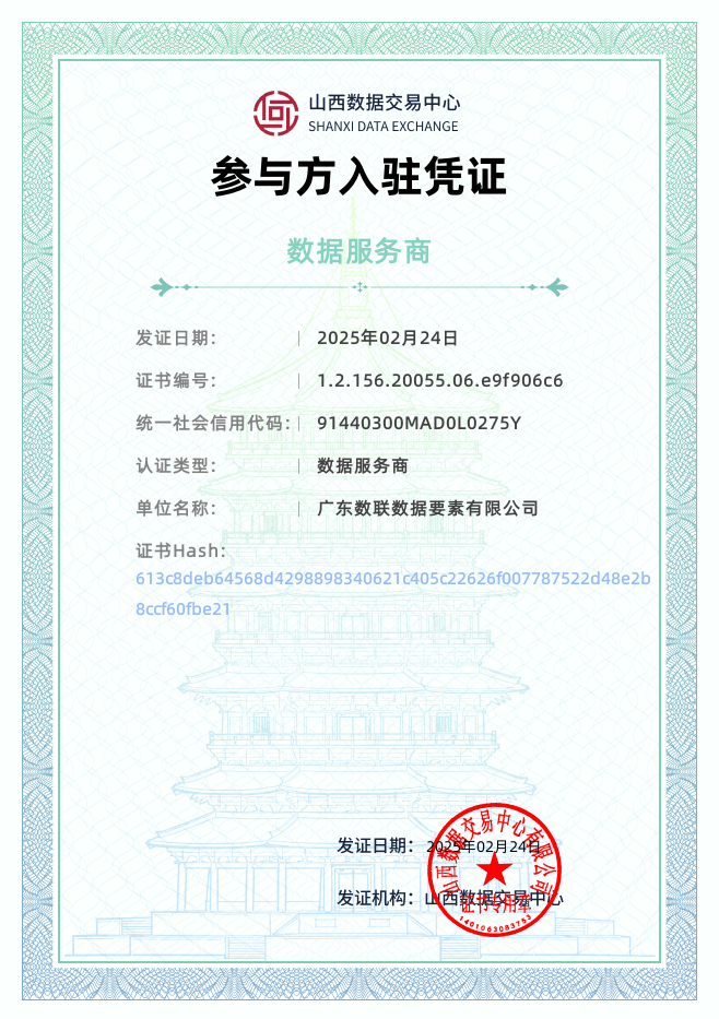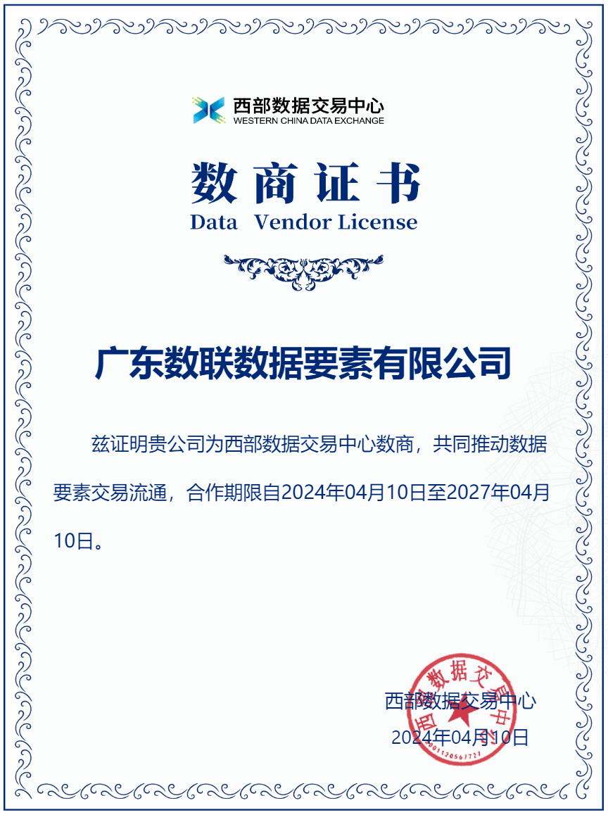 广东数联数据要素有限公司,国内首家数据资产价值变现全链路一站式数据服务商。广东数联数据要素有限公司为立足深圳、辐射全国的一家专注数据要素一站式服务数商,业务涵盖企业数据法律合规、数据质量评价、数据资产入表辅导、数据资产价格评估、数据交易经纪、数据产品挂牌、数据资产管理以及企业高管数据素养提升与数据治理能力培训工作,同时提供数据资产金融市场业务咨询辅导。广东数联数据要素有限公司当前已在国内38家数据交易所获得数商资质认证!各项资质超50余项!公司为2024年第七届数字中国峰会深圳区域数商代表、2024年贵阳第十届数博会数据资产服务联合单位、国家2024数据要素蓝皮书牵头单位及核心策划单位、2024年深圳数据交易所优秀数商、广州数据交易所天河专区联合运营方;公司实际控制人林楠受聘为浙江大数据交易中心数据要素X认证行业专家、江苏省大数据交易和流通工程实验室数据资产专委会专家委员、DAC全球数据资产理事会粤港澳中心主任、全球数据资产运营中心广州基地负责人等,当前已在深圳、北京、河北、河南、湖南、广东、江西、四川等多地落地成功案例,是当前国内顶流数据服务机构之一。